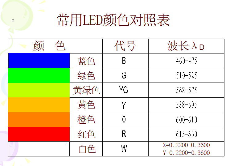 LED背光源燈珠顏色對照圖: